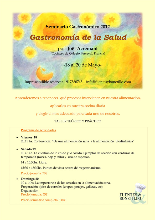 Un año mas viene viene a Madrid a Joël Acremant, autor del libro “Alimentarse Hoy”, autor que nos propone una alimentación consciente desde un pensar claro. Va a impartir un curso en el show cooking de Fuentes y Bonetillo, os paso la información en el cartel de abajo para quien queráis asistir.