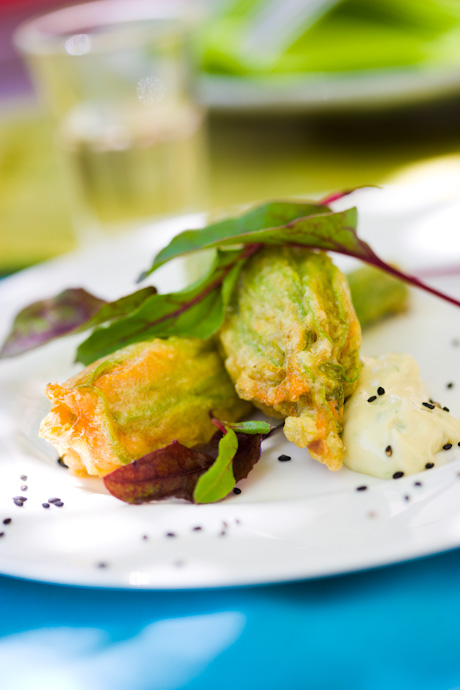 Tenemos un pequeño jardín donde conviven aromáticas, un par de rosales con rosas de insuperable aroma, caléndulas, acelgas, lechugas y plantas de calabacín entre otras varias. Esta temporada pensamos en tomar el calabacín en flor, es tremendamente delicado en su sabor, las flores las hemos rellenado de bacalao y pasas con aroma de estragón.