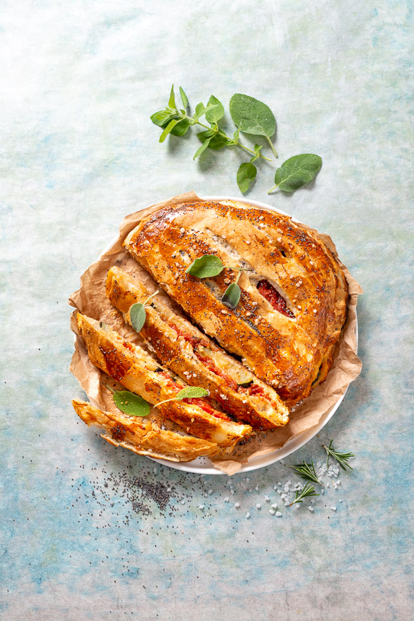El pisto es una preparación de verduras estofadas, estas verduras varían según gusto y temporada, en está receta servimos el pisto en hojaldre para tener un plato vegetariano que se puede tomar caliente o del tiempo.