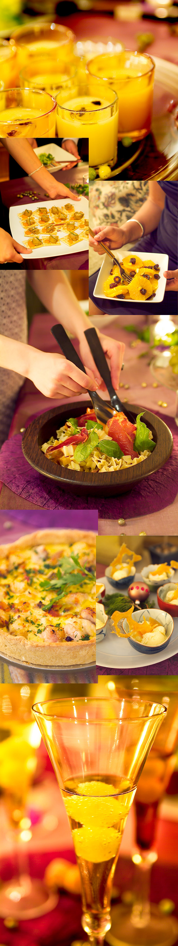 El menú que os propongo es para servirlo en buffet, podemos comenzar con una rica crema de almendras y un escabeche de foie para continuar con dos ensaladas una mas exótica de dátiles con naranja y otra de pasta con ibéricos. Como plato fuerte una tarta de rape y vieras terminando con un suave helado de castañas. Y finalmente nada mejor que brindar con champan,  ¡ ¡¡ salud !!.