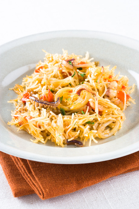 Para esta fideuá suelo utilizar la pasta de fideos denominada cabellín, es muy fina y me gusta como combina con el calamar cocinado en tiras. Se puede acompañar con una salsa alioli en un cuenco aparte. Los mejillones no los añado a la fideuá los sirvo como aperitivo.