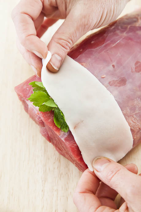 Albardillar es cubrir un alimento total o parcialmente con otro. Se albardan habitualmente carnes y aves con tocino o beicon para que resulten más jugosas y no se resequen durante la cocción. La pieza se sazona, a mi me gusta poner alguna hierba o especia debajo de la albarda, y ésta se ata con hilo de bramante. Antes de sacar a la mesa se retira la albarda.