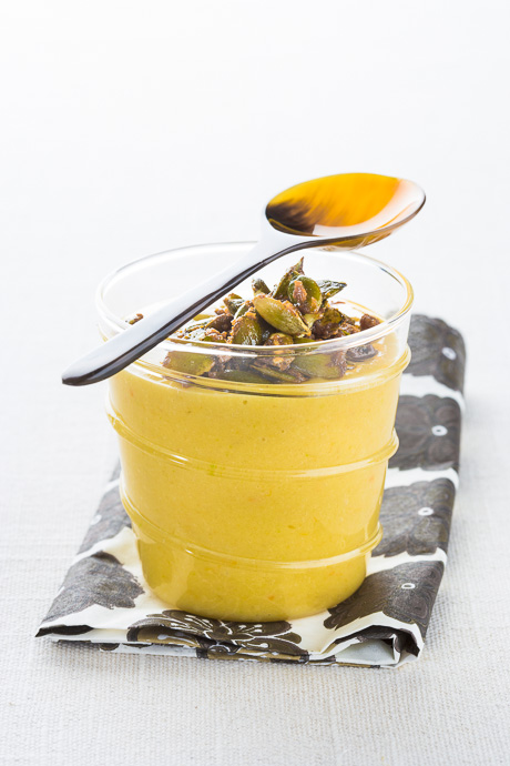 El caqui es un fruto otoñal, exteriormente es de color naranja y rojizo, se consume maduro, cuando su pulpa está muy blanda, su sabor es dulce gelatinado y perfumado, su textura acuosa, cuando no está maduro su sabor es áspero y mas vale esperar. Esta preparación es muy otoñal, la acompañamos con pipas de calabaza garrapiñadas.