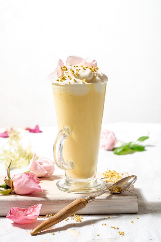 4- Para montar la nata, batir con varillas la nata junto con el azúcar hasta que coja cuerpo. Coronar las copas y decorar con pétalos y flor de sauco.