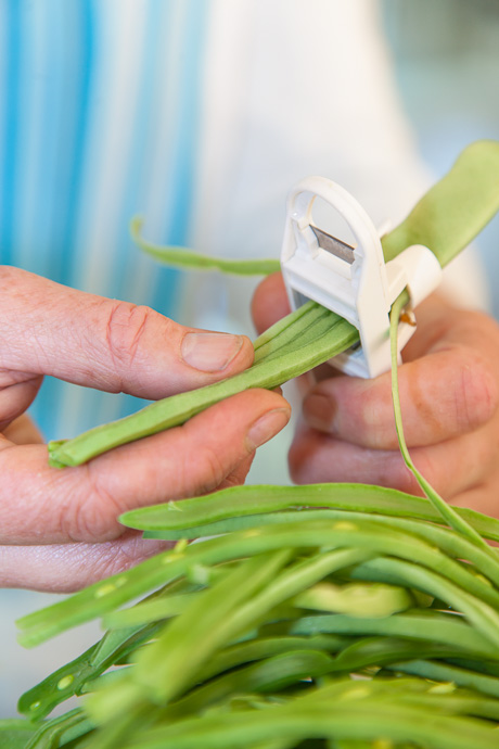 Este utensilio de cocina es muy apropiado para cortar las judías verdes en tiras. Se eliminan los extremos con una cuchilla que tiene este cortador en la parte superior y seguidamente se introduce la judía verde por un orificio seguido de cuatro cuchillas que rebanan la judía, dejando los extremos laterales (hebras duras) fuera del corte. Para que funcione adecuadamente es imprescindible que la judía verde esté fresca y tersa.