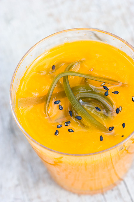 3- Retirar del fuego, salpimentar y triturar.  Servir la crema acompañada de alga kombu cocida  y semillas de sésamo.