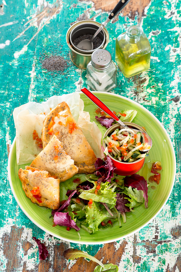 4-Estirar la masa en una superficie plana espolvoreada de harina, con ayuda de un aro cortar las obleas y rellenarlas con el pisto. Cerrar la masa pegando bien las dos partes. Espolvorear las empanadillas con semillas de amapola si se desea, presionando ligeramente para que se peguen.