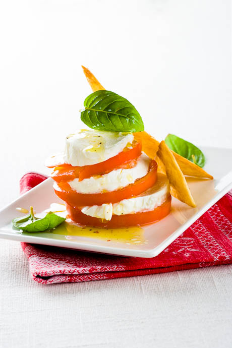 3- Poner las rodajas de mozarella y tomate alternándola en los platos de presentación, salpimentar y regar con el aceite de oliva. Servir la ensalada con las tortitas fritas y hojas frescas de albahaca.