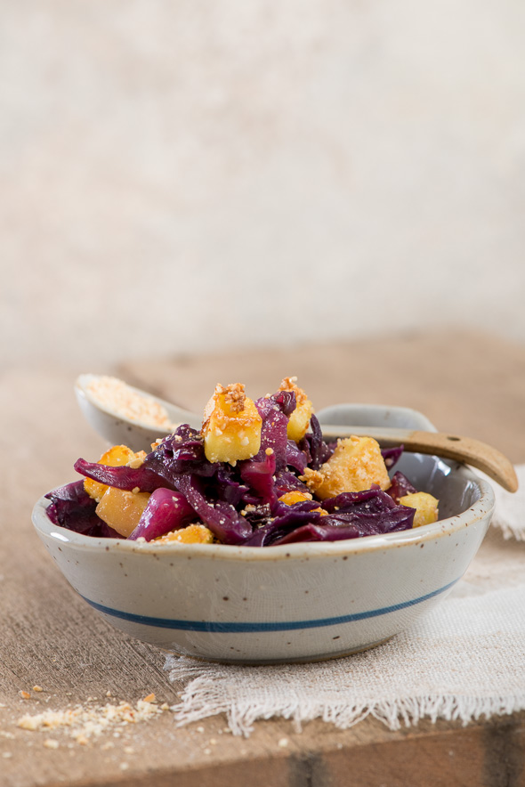 4- Pelar la otra manzana y trocearla en dados medianos, poner una sartén con un fondo de mantequilla y hacer la manzana hasta que esté blanda y dorada. Moler los frutos secos y añadir unos granos de sal. Servir la lombarda coronada con la manzana y espolvoreada de frutos secos