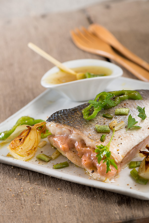 5- Para preparar el acompañamiento, limpiar las cebolletas, picar los ajetes y laminar el pimiento, saltear en un fondo de aceite, salpimentar e incorporar el vino. Tapar y dejar cocer durante 15 minutos. Retirar las lubinas una vez hechas de la fuente  de horno y servir con la salsa aparte y acompañadas con la guarnición.