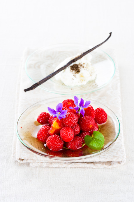 3- Retirar las posibles ramas de los madroños, lavar y secar bien. Incorporar los madroños al almíbar de vainilla caliente y dejar reposar hasta que la mezcla espese ligeramente. Servir los madroños con una crema de queso, mezclada con nata y vainilla.