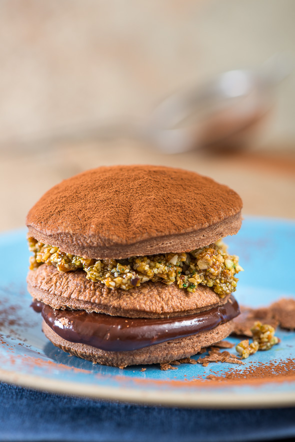 6- Tostar los frutos secos y molerlos, mezclarlos con la miel hasta formar una pasta. Montar las milhojas de la siguiente manera, disponer una capa de hojaldre, otra del relleno de chocolate, otra de hojaldre, los frutos secos molidos y finalizar con una capa de hojaldre, espolvorear con abundante cacao en polvo y servir.
