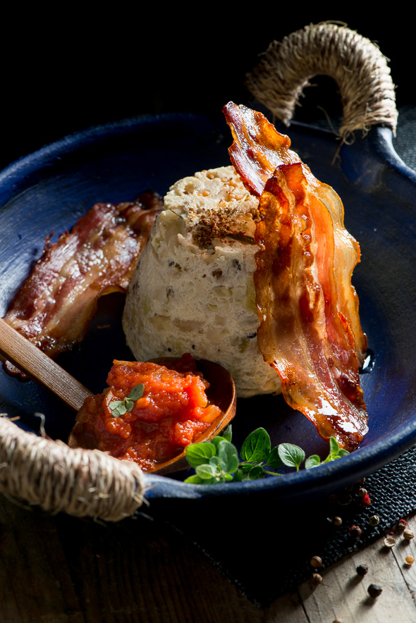 4- Poner las lonchas de panceta adobada sobre un papel antiadherente y hornear uno o dos minutos hasta que estén crujientes. Servir el pastel sazonado con pimienta recién molida, el tomate y la panceta.
