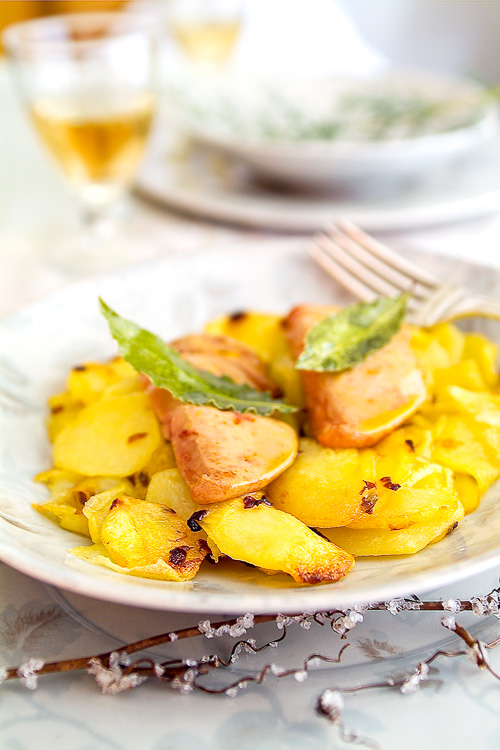 4- Cortamos en láminas el foie gras fresco, cuando las patatas estén cocidas, ponemos el foie sobre las patatas, tapamos con papel antiadherente o un plato para que el foie temple y comience a derretirse. Y servimos calientes.