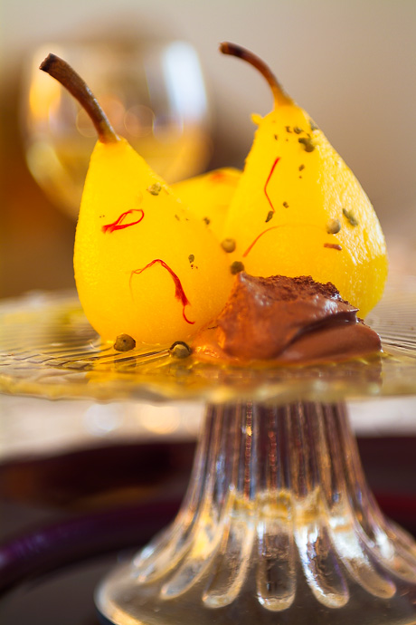3- Montar el resto de la nata y mezclar suavemente con la crema de chocolate. Preparar un frutero con las peras, la salsa de azafrán y el mousse de chocolate. Servir.