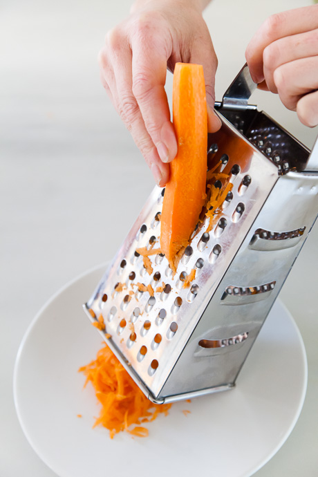 Los alimentos se pelan o se lavan y se pasa por el rallador, éste debe estar sobre un plato o cuenco donde caerá el alimento rallado.