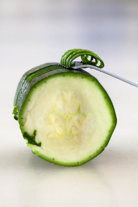 Para rallar en tiras se necesita un rallador en forma de cucharilla, tiene en su parte superior cinco agujeros diseñados para sacar tiras de cítricos y verduras como el calabacín. Las frutas y verduras quedan decoradas y las tiras se utilizan para perfumar y decorar preparaciones.