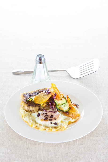 Huevos fritos con chip de verduras