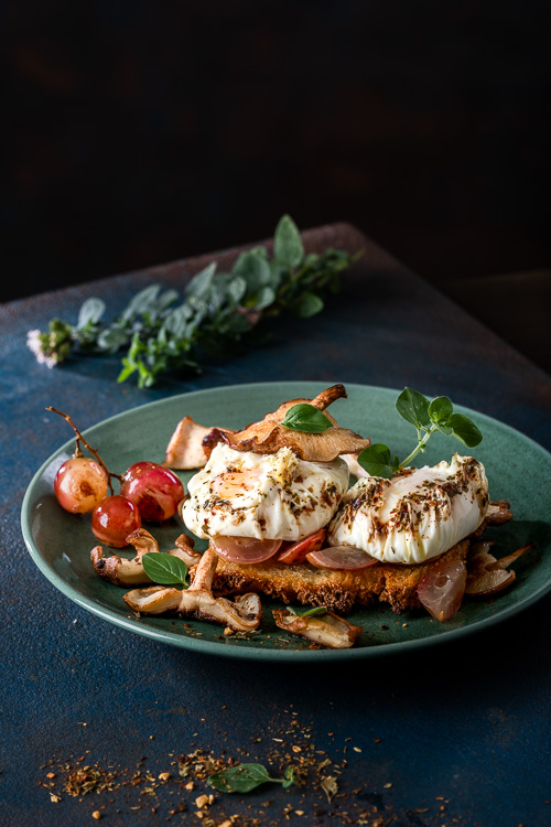 Huevos poché con setas y uvas
