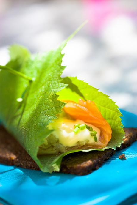 El servir este aperitivo en hojas de vid nos parecía muy bonito pero además resultó ser mas rica la preparación ya que en el reposo las hojas le pasaron aromas al salmón.