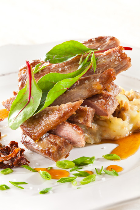 4- Retirar el exceso de grasa de la sartén y desglasar con el vinagre y el zumo para obtener una salsa. Cortar el secreto en piezas de 3 por 5 cm, servir con el puré, unas setas fritas, una cucharada de salsa y ajetes tiernos.