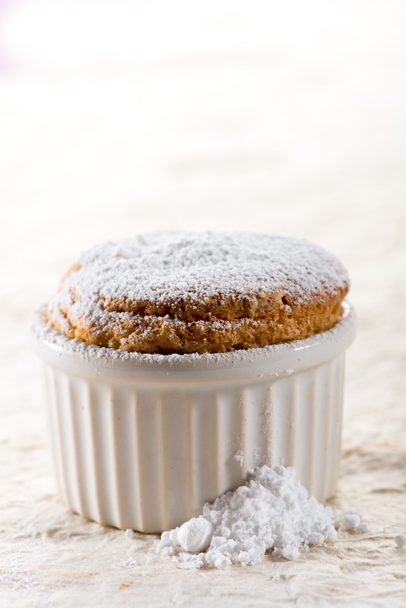 4- Rellenar los moldes hasta el borde, dejándolo limpio para facilitar que suba el souffé. Hornear durante 15 minutos. Servir sin desmoldar espolvoreado de azúcar glacé.