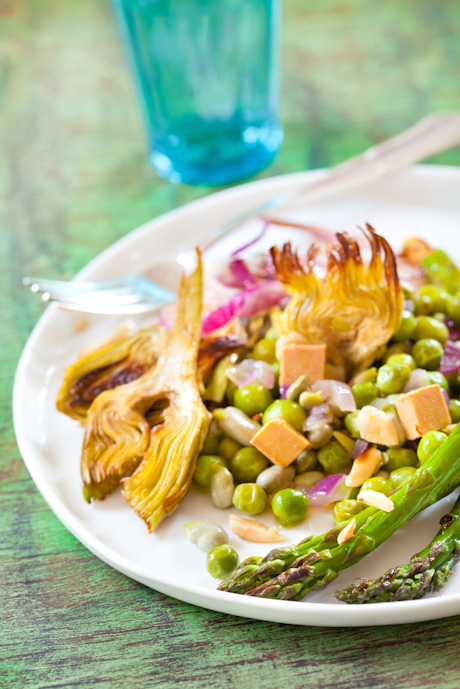 4- Servir los platos con los guisantes, habas y las verduras plancha, acompañar con pequeños dados de foie gras mi-cuit.
