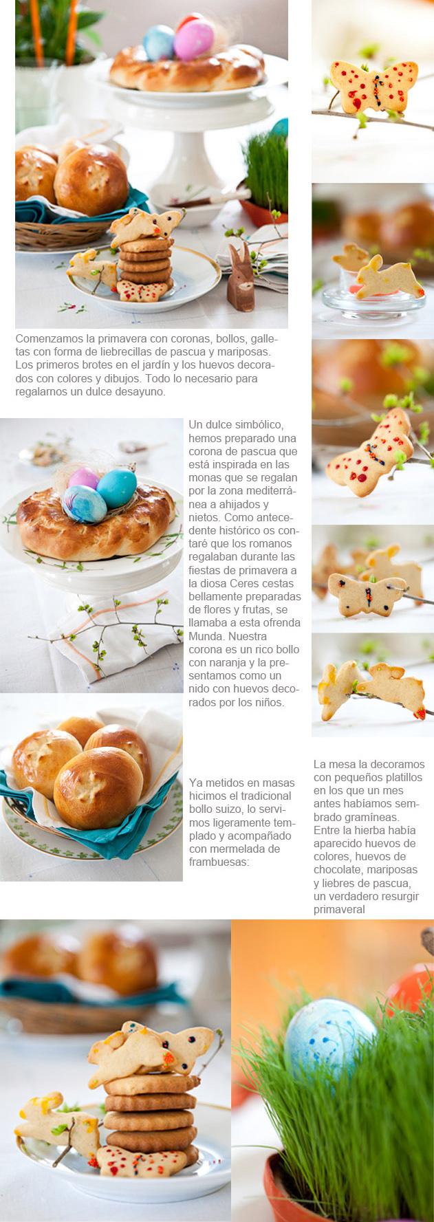 Para festejar la primavera una idea para preparar un desayuno, hemos hecho una corona, unos tradicionales bollos suizos y galletas con motivos de primavera