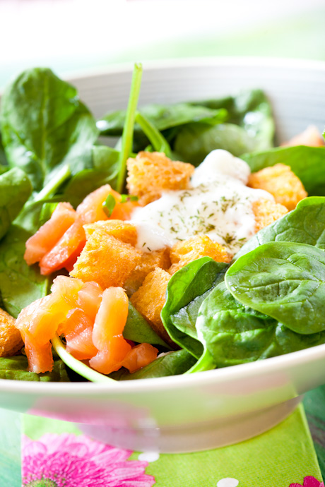 Esta ensalada se prepara con rapidez, en primavera es fácil encontrar espinaca de hoja tierna y pequeña, en esta ocasión la hemos acompañado con salmón ahumado aunque se puede utilizar otros ahumados de atún, bacalao o trucha resultando también muy rica.